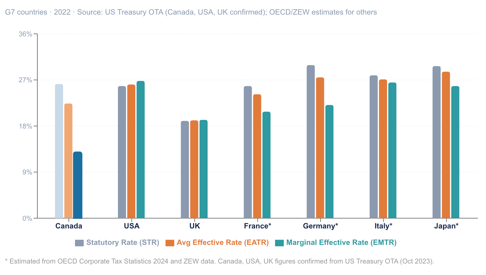 Canada is often described as having an attractive corporate tax environment. But once you look more closely, the picture becomes more complicated. As the chart below shows, the gap between marginal and average effective tax rates reflects a system layered with subsidies, credits, and special arrangements that affect firms very differently.